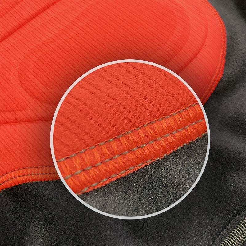 This range has been  developed with an open cell foam a multilayer 65 density (kg /m³) and 120 density (kg /m³) and a total thickness of 16mm which guarantee excellent protection during cycling. The first layer of 65 density and 4mm thickness guarantees a high elasticity of the product and a pleasant feeling of softness in contact with the body. The second layer of 120 density and 12mm thickness supports the cyclist in the extreme distances, ensuring excellent protection and comfort. The perforation of the foam with a 3mm holes, increase significantly the transpiration and passage of air in the pad, giving a pleasant feeling of freshness and allowing the chamois to dry in less time than other traditional products.